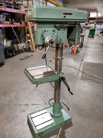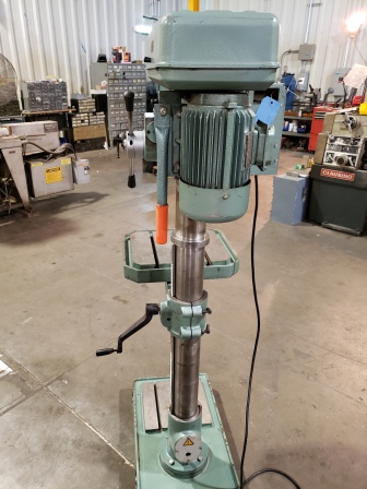 Model: 9400 Includes Free Power Down Feed!! Motor: 2 HP, Single Phase CONTROL BOX: * Infinitely variablespeed with a turn of dial * Instantaneous electronic reversing * Inverter Driven Variable * Full torque at low speeds * All solid state circuitry * Continuous speed adjustment while in operation Spindle Speeds: 0 - 1200 RPM Drills to Center: 18-1/8" Drilling Capacities: Steel 1-1/16" Cast Iron 1-1/4" Tapping Capacity: 3/4" Morse Taper: No. 3 Quill Diameter: 3" Column Diameter: 4" Spindle Travel: 5-3/8" Spindle to Table (MAX): 27-1/4" Spindle to Base: 46-1/4" Shipping Weight: 675 lbs Dimensions: 20"W X 29"D X 69-1/2"H TABLE: Production type: * T-Slotted 15 7/8" X 17 7/8" * 2 Slots for 1/2" t-bolts * Ground working surface * Coolant trough BASE: T-Slotted * 16 3/8" x 26 5/8" * 2 slots for 1/2" t-bolts * Ground working surface FEATURES: * POWER DOWN FEED! * Variable speed from 0 to 1200 RPM * Adjust speeds while operating in the material * High torque at low rpm speeds * Instantaneous reversing for tapping * Tapping head is not needed * Machine tap goes into ball bearing chuck * Can tap either left or right handed threads * Drill head and table rotate 360-degree around column * Smooth operating table raiser * Fully enclosed spindle * Quill lock and depth control * Speed control * Continuous speed adjustment while in operation * Instantaneous reversing for tapping * One turn on knob for adjusting speed (0 to 1200 RPM) IMPORTANT CONDITIONS OF THIS QUOTATION: All relevant facts about the above machinery are believed to be accurate, but none are guaranteed. It is the sole responsibility of the buyer to verify all aspects of the machine tool, descriptions, specifications, condition, and suitability of the intended usage. All machines are quoted subject to prior sale, availability, and buyer verification of specifications. Typographical and clerical errors are subject to correction. Thank you for giving us the opportunity to quote your machinery needs.