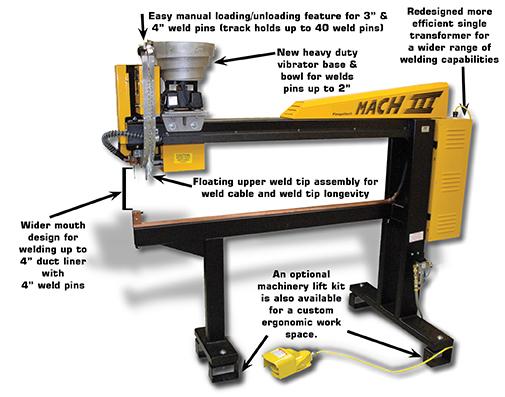 MODEL: FG MACH III DURODYNE STK# 18004 SEE ATTACHED .PDF FOR DETAILED SPECS ELECTRICAL: Input voltage: 230V, 60 Hz single phase, 60 amp service. AIR REQUIREMENT: INPUT PRESSURE OF 80 PSI THROAT: 69" THROAT PIN CAPACITY: The vibrator bowl holds approximately 1,000, 1 inch fasteners. Fasteners of .5" to 2" in length may be fed automatically. Manual feed available for up to 4" The FG Mach III Pinspotter was designed utilizing the best of current technologies to provide greater power and reliability for insulation fastening. The inherent minimal material handling and the use of welded pins will insure your shop a cost efficient, quality product. Our upgraded FG Mach III machine is capable of welding pins up to 4'' to address the higher R- value insulation now being specified throughout the industry. Will weld the full range of Duro Dyne pins on galvanized metal up to 18 gauge An optional machinery lift kit (#17135) is also available for a custom ergonomic workspace.